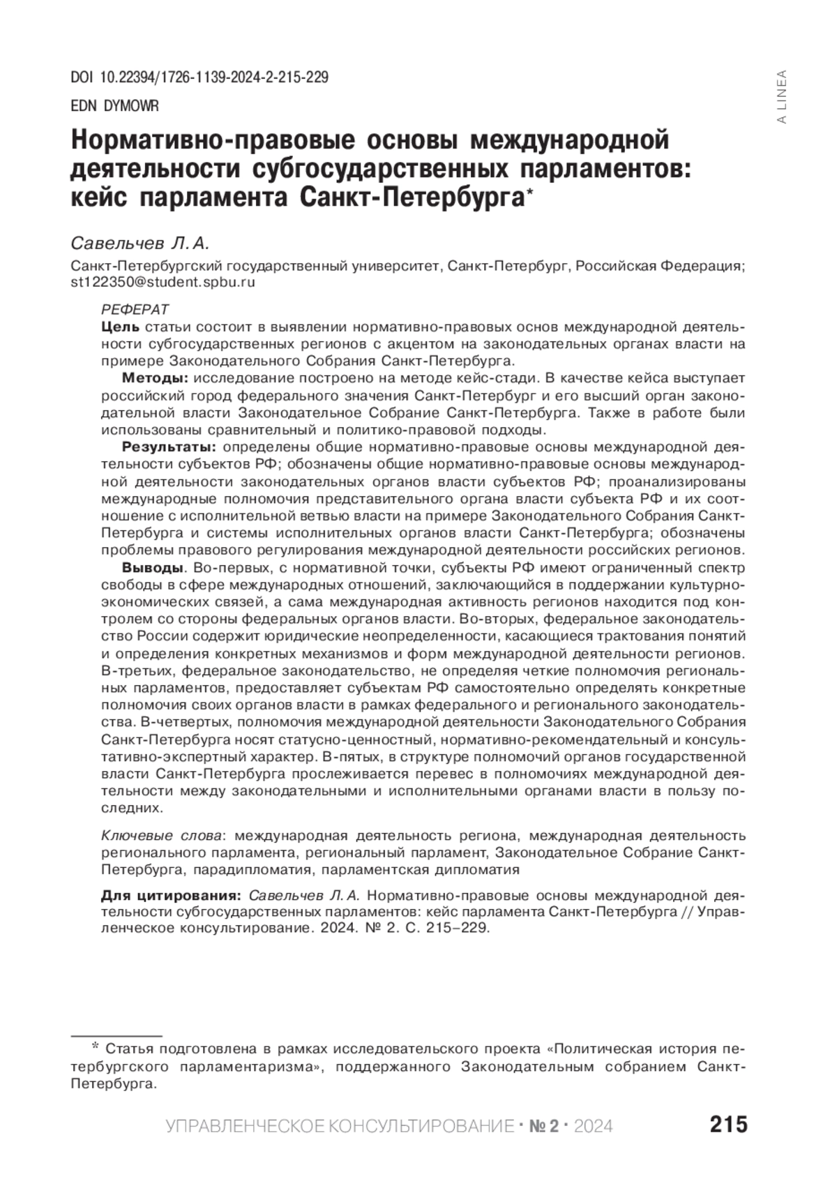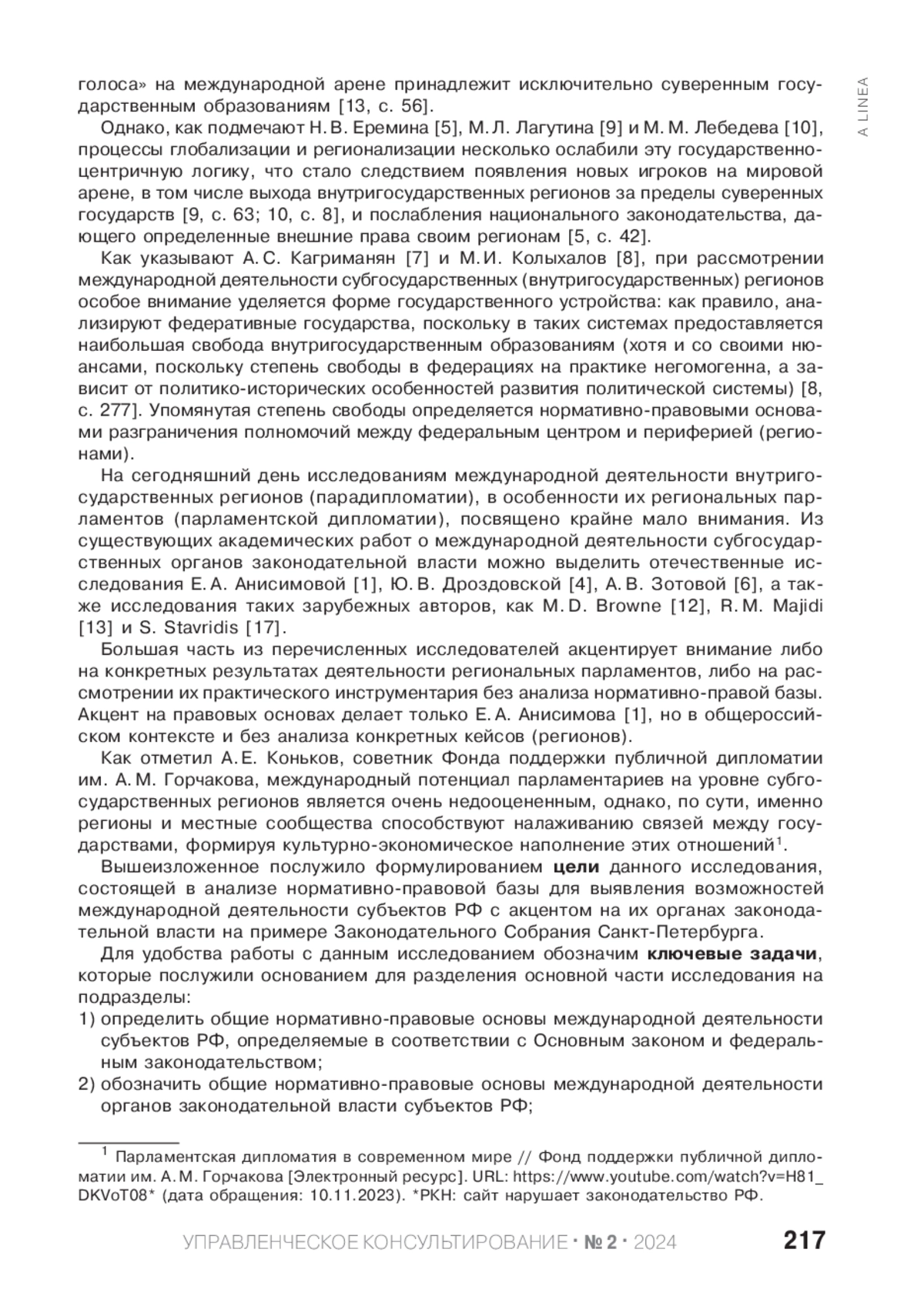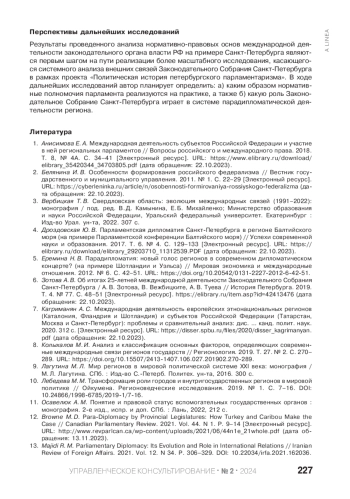 1. Анисимова Е. А. Международная деятельность субъектов Российской Федерации и участие в ней региональных парламентов // Вопросы российского и международного права. 2018. Т. 8, № 4A. С. 34-41. URL: download/elibrary_35420344_34703805.pdf (дата обращения: 22.10.2023). EDN: XWCDRJ