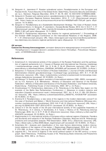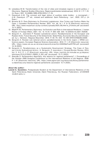 16. Sergunin A. Paradiplomacy as a Sustainable Development Strategy: The Case of Russia’s Arctic Subnational Actors / A. Sergunin, P. Joenniemi // Eurasia Border Review. 2014. Vol. 5. N 2. P. 1-17. URL: https://eprints.lib.hokudai.ac.jp/dspace/bitstream/2115/57854/1/EBR5_2_001.pdf (дата обращения: 13.11.2023).