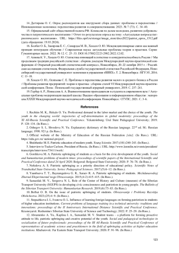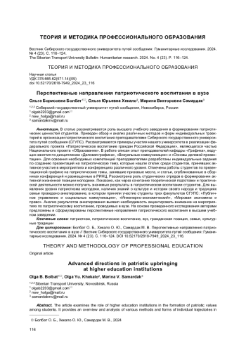 В статье рассматривается роль высшего учебного заведения в формировании патриотических ценностей студентов. Приведен обзор и анализ различных методов и форм индивидуальных траекторий в организации патриотического воспитания преподавателями Сибирского государственного университета путей сообщения (СГУПС). Рассматриваются примеры участия нашего университета в реализации федерального проекта «Патриотическое воспитание граждан Российской Федерации», являющегося частью Национального проекта «Образование». В работе описан опыт преподавателей кафедры «Графика», ведущих занятия по дисциплинам «Деловая графика», «Визуальные коммуникации» и «Основы деловой презентации». Для освоения необходимых компетенций преподавателями разработаны индивидуальные задания по созданию презентаций на патриотическую тему, которые нашли отклик среди студентов, принявших активное участие в мероприятиях и конференциях различного уровня. Отмечены работы студентов по презентационной графике на патриотические темы, занявшие призовые места, и статьи, опубликованные в сборниках конференций и размещенные в РИНЦ. Рассмотрена роль студенческих отрядов в формировании активной жизненной позиции молодежи. Показано, как через сочетание теоретической подготовки и практической деятельности можно получить значимые результаты в патриотическом воспитании студентов. Для выявления уровня патриотизма молодежи, наличия знаний о культуре и истории своего народа и традициях семьи проведено анкетирование, в котором приняли участие студенты трех факультетов СГУПС: «Публичное управление и социальные коммуникации», «Инженерно-экономический», «Мировая экономика и право». Анализ результатов анкетирования выявил необходимость акцентировать внимание на мероприятиях по патриотическому воспитанию, проводимых в вузе. На основе проведенного исследования авторами предложены и сформулированы перспективные направления патриотического воспитания в высшем учебном заведении.