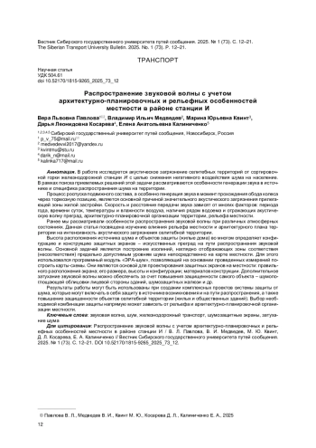 1. Затухание шума на территории жилой застройки вблизи станции И при различных атмосферных состояниях / В. Л. Павлова, Е. А. Калиниченко, И. В. Пирумова, И. А. Селюнин // Вестник Сибирского государственного университета путей сообщения. 2024. № 5 (72). С. 45-52. EDN: EZDHCF