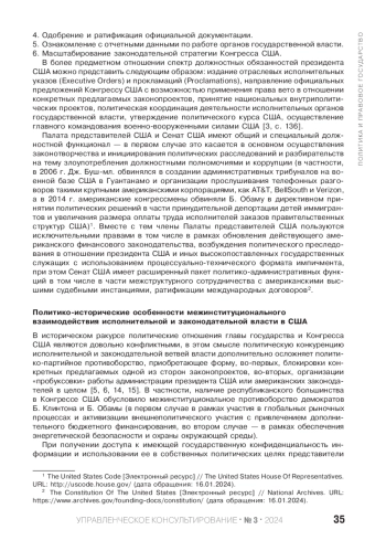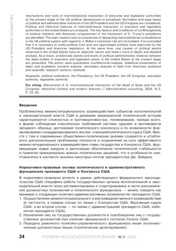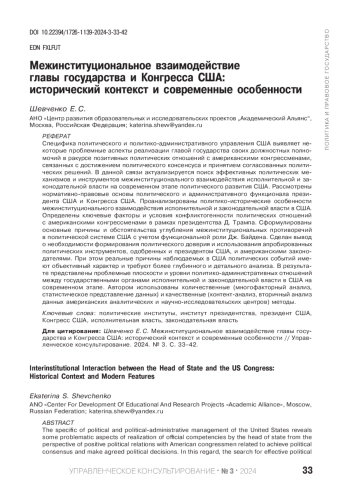 Специфика политического и политико-административного управления США выявляет некоторые проблемные аспекты реализации главой государства своих должностных полномочий в ракурсе позитивных политических отношений с американскими конгрессменами, связанных с достижением политического консенсуса и принятием согласованных политических решений. В данной связи актуализируется поиск эффективных политических механизмов и инструментов межинституционального взаимодействия исполнительной и законодательной власти на современном этапе политического развития США. Рассмотрены нормативно-правовые основы политического и административного функционала президента США и Конгресса США. Проанализированы политико-исторические особенности межинституционального взаимодействия исполнительной и законодательной власти в США. Определены ключевые факторы и условия конфликтогенности политических отношений с американскими конгрессменами в рамках президентства Д. Трампа. Сформулированы основные причины и обстоятельства углубления межинституциональных противоречий в политической системе США с учетом функциональной роли Дж. Байдена. Сделан вывод о необходимости формирования политического доверия и использования апробированных политических инструментов, одобренных и президентом США, и американскими законодателями. При этом реальные причины наблюдаемых в США политических событий имеют объективный характер и требуют более глубинного и детального анализа. В результате представлены проблемные плоскости и уровни политико-административных отношений между государственными органами исполнительной и законодательной власти в США на современном этапе. Автором использованы количественные (многофакторный анализ, статистическое представление данных) и качественные (контент-анализ, вторичный анализ данных американских аналитических и научно-исследовательских центров) методы.