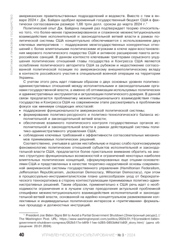 Проблематика межинституционального взаимодействия субъектов исполнительной и законодательной власти США в динамике американской политической истории характеризуется сложностью и противоречивостью, понимаемыми, прежде всего, в форме соблюдения классических требований системы сдержек и противовесов западного образца, достижения политического консенсуса и по возможности формулирования солидаризированного внутри- и внешнеполитического курса США. Вместе с тем в современных общественно-политических реалиях создаются и углубляются дополнительные проблемные плоскости и ограничения на пути эффективного межинституционального взаимодействия главы государства и Конгресса США, формирующие новые ракурсы и диспозиции обеспечения политической стабильности и принятия принципиально важных политических решений, что в особенности симптоматично в контексте анализа некоторых итогов президентства Дж. Байдена