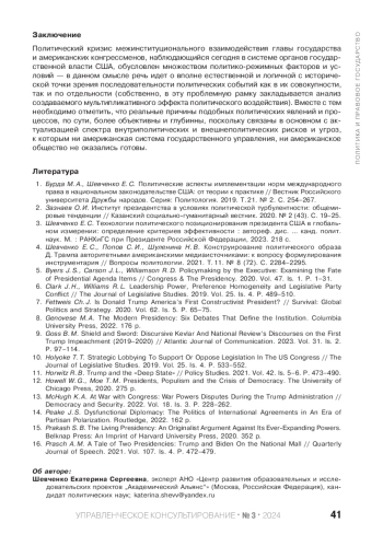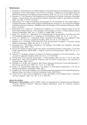 3. Шевченко Е. С. Технологии политического позиционирования президента США в глобальном измерении: определение критериев эффективности: автореф. дис. … канд. полит. наук. М.: РАНХиГС при Президенте Российской Федерации, 2023. 218 с. EDN: KAPDDR