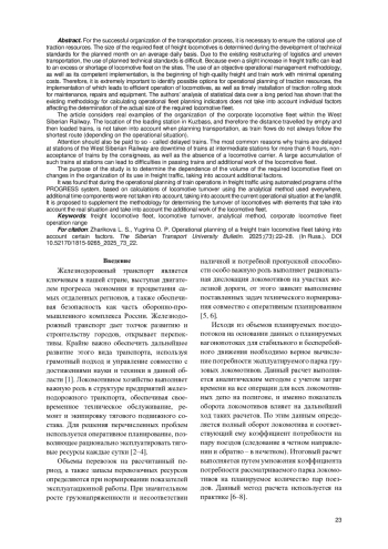 Для успешной организации перевозочного процесса необходимо обеспечить рациональную эксплуатацию тяговых ресурсов. Размеры требуемого парка локомотивов грузового движения определяются при разработке плановых технических норм на месяц в среднесуточном исчислении. В связи с перестройкой логистики и неравномерностью перевозок использование плановых технических норм затруднительно, поскольку даже незначительное повышение объемов грузоперевозок может привести к избытку или недостатку локомотивного парка на участках. Грамотная реализация объективной методики оперативного управления позволяет качественно выполнять грузовую и поездную работу с минимальными эксплуатационными затратами. Поэтому крайне важно определить возможные варианты оперативного планирования тяговых ресурсов, выполнение которых приведет к эффективной эксплуатации локомотивов, а также к своевременной постановке тягового подвижного состава на техническое обслуживание, ремонты и экипировку. Выполненный авторами анализ статистических данных за длительный период показал, что существующая методика расчета показателей оперативного планирования локомотивного парка не учитывает отдельные факторы, влияющие на определение реальных размеров требуемого локомотивного парка.