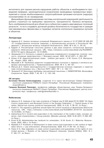 3. Захарцова Н. А. Контроль и надзор в механизме современного государства: понятие, сущность, основные характеристики // Молодой ученый. 2022. № 42 (437). С. 293-297. EDN: XTIYLK