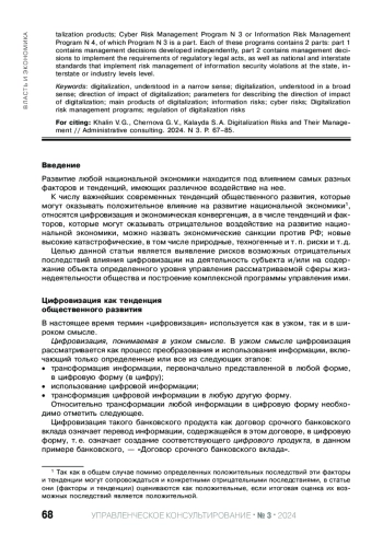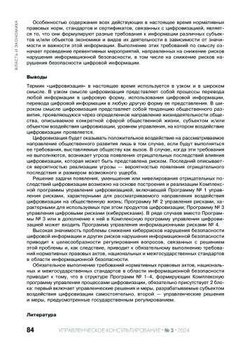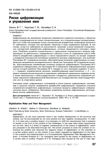 1. Халин В. Г., Чернова Г. В. Цифровизация и киберриски // Управленческое консультирование. 2023. № 7. С. 28-41. EDN: DENMOZ