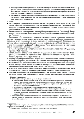Цифровизация как важнейшая тенденция современного развития экономики и общества может сопровождаться не только положительными, но и отрицательными последствиями. Для того чтобы она оказывала только положительное воздействие, необходимо выполнить те требования, которые она выставляет обществу в виде содержания вызовов. В том случае, когда эти требования не выполняются, возникает угроза появления отрицательных последствий воздействия цифровизации, которые предлагается описывать через риск. Проблему усиления положительного и уменьшения отрицательного влияния цифровизации на деятельность определенного субъекта и/или на содержание какого-либо объекта воздействия цифровизации в статье предлагается решать на основе создания и внедрения Комплексной программы управления рисками цифровизации. Она включает Программу № 1 управления рисками, обусловленными влиянием цифровизации на определенное направление жизнедеятельности общества; Программу № 2 управления рисками, обусловленными применением основных продуктов цифровизации; Программу № 3 управления киберрисками или Программу № 4 управления информационными рисками, частью которой является Программа № 3. Каждая из этих программ содержит 2 части: ч. 1 содержит управленческие решения, разрабатываемые самостоятельно, ч. 2 - содержит управленческие решения по реализации требований нормативных правовых актов, а также национальных и межгосударственных стандартов, реализующих управление рисками нарушения информационной безопасности на государственном, межгосударственном или на отраслевом уровне.