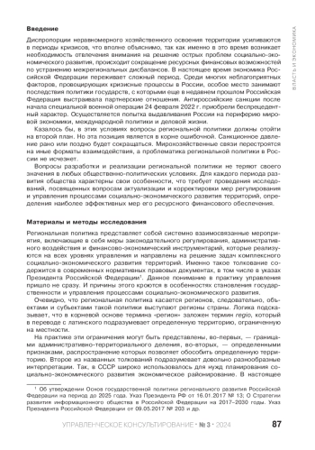 Диспропорции неравномерного хозяйственного освоения территории усиливаются в периоды кризисов, что вполне объяснимо, так как именно в это время возникает необходимость отвлечения внимания на решение острых проблем социально-экономического развития, происходит сокращение ресурсных финансовых возможностей по устранению межрегиональных дисбалансов. В настоящее время экономика Российской Федерации переживает сложный период. Среди многих неблагоприятных факторов, провоцирующих кризисные процессы в России, особое место занимают последствия политики государств, с которыми еще в недавнем прошлом Российская Федерация выстраивала партнерские отношения. Антироссийские санкции после начала специальной военной операции 24 февраля 2022 г. приобрели беспрецедентный характер. Осуществляется попытка выдавливания России на периферию мировой экономики, международной политики и деловой жизни
