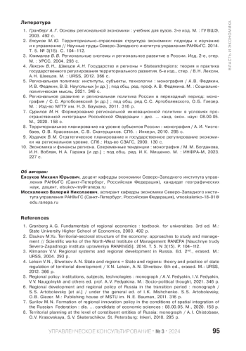 2. Елсуков М. Ю. Территориально-отраслевая структура экономики: подходы к изучению и к управлению // Научные труды Северо-Западного института управления РАНХиГС. 2014. Т. 5. № 3(15). С. 104-112. EDN: UMJTEZ