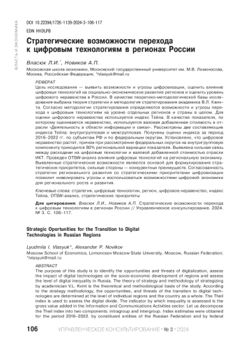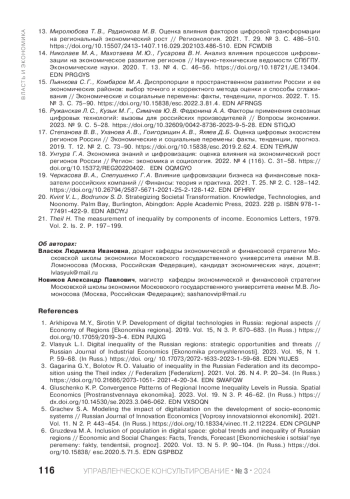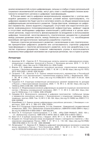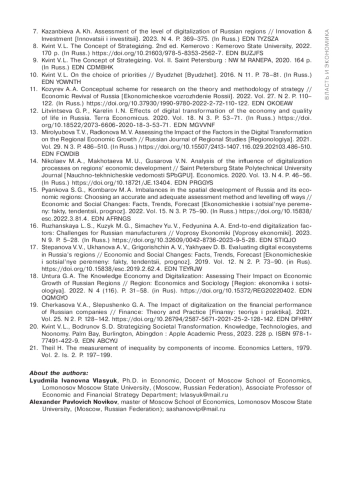 2. Власюк Л. И. Цифровое неравенство российских регионов: стратегические возможности и угрозы // Экономика промышленности. 2023. Т. 16. № 1. С. 59-68. DOI: 10.17073/2072-1633-2023-1-59-68 EDN: YIUJES