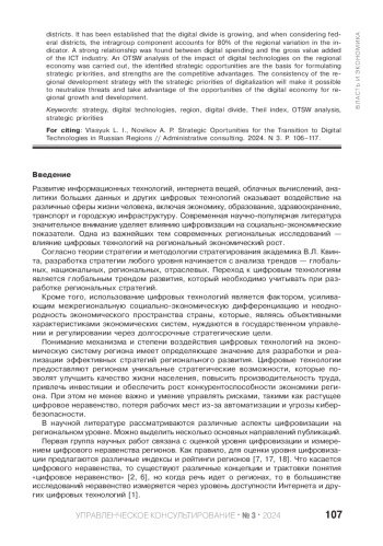 Цель исследования - выявить возможности и угрозы цифровизации, оценить влияние цифровых технологий на социально-экономическое развитие регионов и оценить уровень цифрового неравенства в России. В качестве теоретико-методологической базы исследования выбрана теория стратегии и методология стратегирования академика В. Л. Квинта. Согласно методологии стратегирования определяются возможности и угрозы перехода к цифровым технологиям на уровне отдельных регионов и страны в целом. Для оценки цифрового неравенства используется индекс Тейла. В качестве показателя, по которому оценивается неравенство, используется валовая добавленная стоимость в отрасли «Деятельность в области информации и связи». Рассмотрены две составляющие индекса Тейла: внутригрупповая и межгрупповая. Получены оценки индекса за период 2016-2022 гг. по субъектам РФ и по федеральным округам. Установлено, что цифровое неравенство растет, причем при рассмотрении федеральных округов на внутригрупповую компоненту приходится 80% региональной вариации показателя. Выявлена сильная связь между расходами на цифровые технологии и валовой добавленной стоимостью отрасли ИКТ. Проведен OTSW-анализ влияния цифровых технологий на региональную экономику. Выявленные стратегические возможности являются основой для формулирования стратегических приоритетов, сильные стороны - конкурентных преимуществ. Согласованность стратегии регионального развития со стратегическими приоритетами цифровизации позволит нивелировать угрозы и воспользоваться возможностями цифровой экономики для регионального роста и развития.