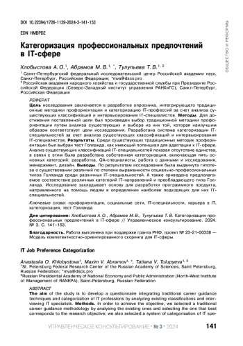 Методы. Для достижения поставленной цели был произведен выбор традиционной методики профориентации путем анализа существующих и выбора из них той, которая наилучшим образом соответствует цели исследования. Разработана система категоризации ITспециальностей за счет анализа существующих классификаций и интервьюирования IT-специалистов.