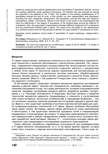 Выводы. По результатам исследования была выдвинута гипотеза о существовании различий по степени выраженности социально-профессиональных типов Голланда среди различных IT-специальностей. А также приведено предполагаемое соответствие различных категорий IT-направлений и преобладающего типа Голланда. Исследование закладывает основу для разработки программного продукта, направленного на помощь людям в определении наиболее подходящих для них ITспециальностей.