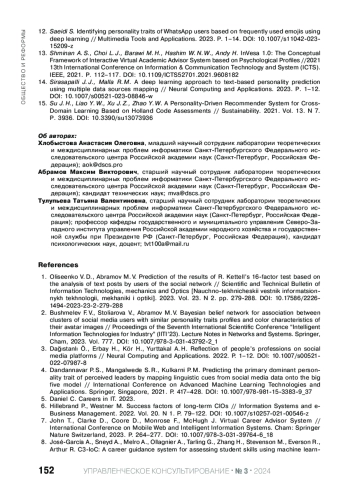 1. Олисеенко В. Д., Абрамов М. В. Предсказание результатов 16-факторного теста Р. Кеттелла на основе анализа текстовых постов пользователей социальной сети // Научно-технический вестник информационных технологий, механики и оптики. 2023. Т. 23. № 2. С. 279-288. DOI: 10.17586/2226-1494-2023-23-2-279-288 EDN: URYSMR