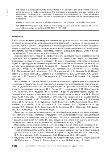 In the article, the author conducted a review of modern research on the stated topic and concluded that from the standpoint of sociology, the category of mentoring seems insufficiently researched (in this vein, it is given much less attention in the scientific literature). Mentoring, studied by specialists within the framework of the sociological sciences, was usually considered from the standpoint of the concepts of structural functionalism and social exchange (A. Goffman; J. Allan; E. Gardiner, etc.). For the sociological concepts of the mentoring institute, the basic factor is the category of socialization. Mentoring, along with the processes of education and upbringing, is an integral component of socialization. The practice of introducing mentoring allows us to state the ambiguity and vagueness of the mentor’s ideas about himself and his role, as well as the image of the mentor for his wards, which creates obstacles to instilling standards of mentoring in terms of its organization and successful implementation, both at the individual and group levels. It should be noted that the focus of mentoring has shifted from its representation as a conductor of powerand holder of a certain structure to its importance in the education and development of the corporate culture of a modern organization. The processes of socialization are also related to the mechanisms of adaptation and motivation. If adaptation is considered as part of the socialization process, then, as for motivation, its role in the sociological mechanism of the mentoring institute is debatable.