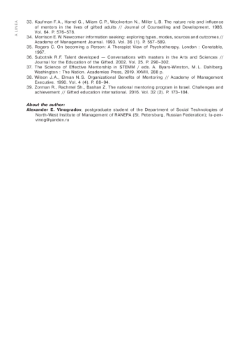 33. Kaufman F. A., Harrel G., Milam C. P., Woolverton N., Miller L. B. The nature role and influence of mentors in the lives of gifted adults // Journal of Counselling and Development. 1986. Vol. 64. P. 576-578.