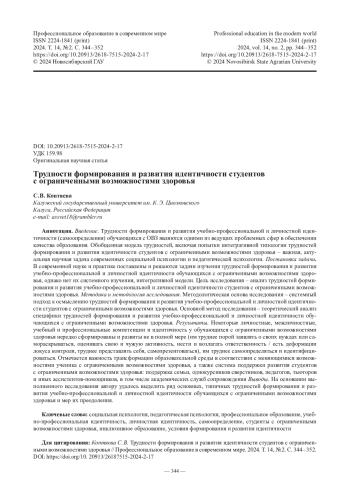 Постановка задачи. В современной науке и практике поставлены и решаются задачи изучения трудностей формирования и развития учебно-профессиональной и личностной идентичности обучающихся с ограниченными возможностями здоровья, однако нет их системного изучения, интегративной модели. Цель исследования – анализ трудностей формирования и развития учебно-профессиональной и личностной идентичности студентов с ограниченными возможностями здоровья.