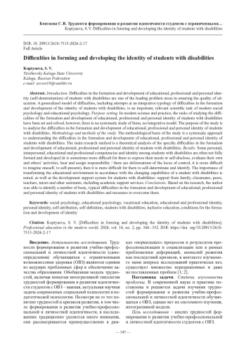 Введение. Трудности формирования и развития учебно-профессиональной и личностной идентичности (самоопределения) обучающихся с ОВЗ являются одними из ведущих проблемных сфер в обеспечении качества образования. Обобщенная модель трудностей, включая попытки интегративной типологии трудностей формирования и развития идентичности студентов с ограниченными возможностями здоровья – важная, актуальная научная задача современных социальной психологии и педагогической психологии.