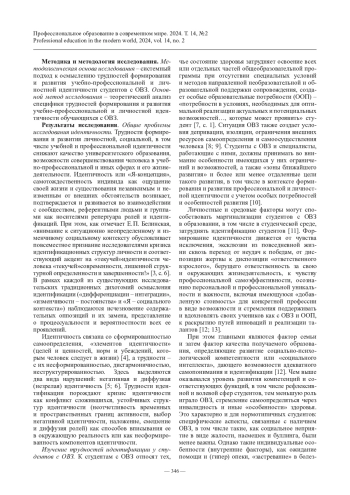 Методика и методология исследования. Методологическая основа исследования – системный подход к осмыслению трудностей формирования и развития учебно-профессиональной и личностной идентичности студентов с ограниченными возможностями здоровья. Основной метод исследования – теоретический анализ специфики трудностей формирования и развития учебно-профессиональной и личностной идентичности обучающихся с ограниченными возможностями здоровья.