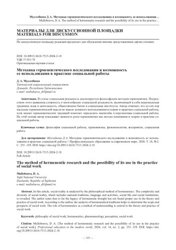 В статье социальная реальность анализируется философским методом герменевтики. Посредством этого выявлены сложность и многообразие социальной реальности, включающей в себя национальные традиции, язык и деятельность, общественное бытие и социальные институты. Автор отмечает, что до сих пор наследие герменевтической мысли не нашло должного использования в теории и практике социальной работы, хотя анализ герменевтических традиций помогает определить масштабы и перспективы социальной работы. На этой основе автор показывает важность роли герменевтики как метода понимания в теории и практике социальной работы.