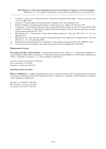 9. Муллобоева Д. А. Перспективы развития социальной работы как профессии в Таджикистане // Вестник ТНУ. № 1. С. 135 - 138. Душанбе, 2020.