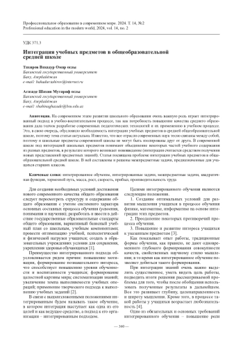 На современном этапе развития школьного образования очень важную роль играет интегрированный подход в учебно-воспитательном процессе, так как потребность повышение качества среднего образования дала толчок разработке современных педагогических технологий и их применению в учебном процессе. Это, в свою очередь, обусловило необходимость интеграции учебных предметов в средней общеобразовательной школе, поэтому тема статьи актуальна. Известно, что все отрасли современных наук тесно связаны между собой, поэтому и школьные предметы современной школы не могут быть изолированы друг от друга. В современной школе под интеграцией школьных предметов понимают объединение некоторых частей учебного содержания из разных предметов, в результате которого возникает нововведение (интеграция считается средством получения новых представлений предметных знаний). Статья посвящена проблеме интеграции учебных предметов в общеобразовательной средней школе. В ней составлены и решены межпредметные задачи, предназначенные для учащихся старших классов.