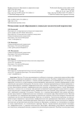 Введение. В статье рассматриваются особенности подходов к осмыслению вопросов философии образования, основанные на принципах и данных социальной экологии. Подобные энвайронменталистские подходы, предвосхищенные еще в работах Э. Геккеля, активно развиваются на сегодняшний день, что находит свое выражение, в частности, в существовании специализированных периодических изданий и формировании особых тематических пространств обсуждения.
