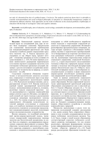 Выводы. Осуществленное рассмотрение показывает, что энвайронментализм и социально-экологическую философию образования целесообразно рассматривать как тематически однородный комплекс содержательно различающихся решений. Подобные подходы представляют собой результат рефлексии классической проблематики философии образования с помощью «экологических» ценностных и когнитивных установок.