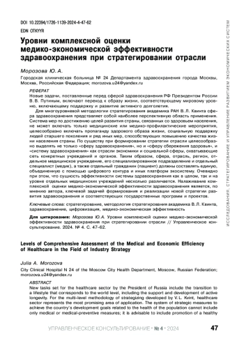 New tasks set for the healthcare sector by the President of Russia include the transition to a lifestyle that corresponds to the world level, including the support and development of active longevity. For the multi-level methodology of strategizing developed by V. L. Kvint, healthcare sector represents the most promising area of application. The system of strategic measures to achieve the country’s development goals related to the health of the population cannot include only medical or medical-preventive measures; it is advisable to include promotion of a healthy lifestyle, social support for older people and other measures. Essentially, in strategizing, it is advisable to single out the “health care sector” or, more precisely, the “health saving” sphere, which includes all the forces associated with the focus on increasing life expectancy, and the “health care system” as a branch of the economy and social sphere, covering a network of specific institutions and bodies. Thus, a sphere, an industry, a region, an individual medical institution, its specialized unit and an individual medical specialist, as well as an individual citizen (patient) must form a single strategic system (using a digital circuit and other platforms). It is obvious that the essence of the medical effectiveness of the healthcare system as a whole and at the level of individual medical institutions is somewhat different. Establishing a comprehensive all-level assessment of the medical and economic effectiveness of healthcare is, in the author’s opinion, a key task in the formation and implementation of a new healthcare development strategy and relevant government programs and projects. Aligning national, regional and global interests requires such strategic management within a single digital health system.