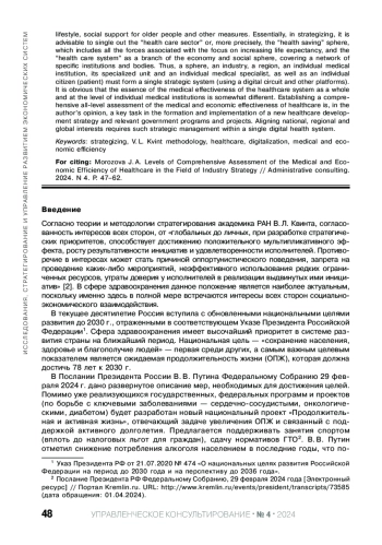 Новые задачи, поставленные перед сферой здравоохранения РФ Президентом России В. В. Путиным, включают переход к образу жизни, соответствующему мировому уровню, включающему поддержку и развитие активного долголетия. Для многоуровневой методологии стратегирования академика РАН В. Л. Квинта сфера здравоохранения представляет собой наиболее перспективную область применения. Система мер по достижению целей развития страны, связанных со здоровьем населения, не может включать только медицинские или медико-профилактические мероприятия, целесообразно включать пропаганду здорового образа жизни, социальную поддержку людей старшего поколения и ряд иных мер, способствующих повышению качества жизни населения страны. По существу при формировании стратегии отрасли целесообразно выделять не только «сферу здравоохранения», но и «сферу сбережения здоровья», и «систему здравоохранения» как отрасли экономики и социальной сферы, охватывающие сеть конкретных учреждений и органов. Таким образом, сфера, отрасль, регион, отдельное медицинское учреждение, его специализированное подразделение и отдельный специалист (медик), а также отдельный гражданин (пациент) должны составлять единую, объединенную с помощью цифрового контура и иных платформ экосистему. Очевидно при этом, что сущность эффективности системы здравоохранения как в целом, так и на уровне отдельных медицинских учреждений несколько различается. Налаживание комплексной оценки медико-экономической эффективности здравоохранения является, по мнению автора, ключевой задачей формирования и реализации новой стратегии развития здравоохранения и соответствующих государственных программ и проектов.
