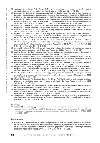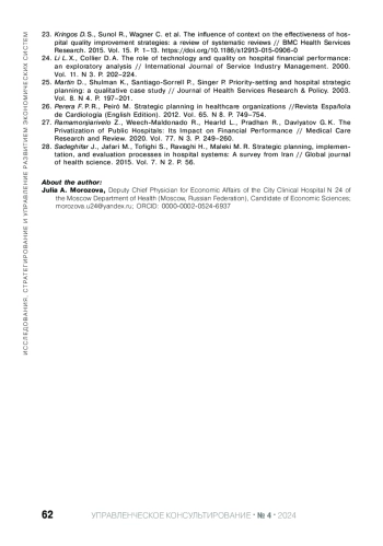 22. Kaissi A. A., Begun J. W. Strategic planning processes and hospital financial performance // Journal of Healthcare Management. 2008. Vol. 53. N 3. P. 197-208.