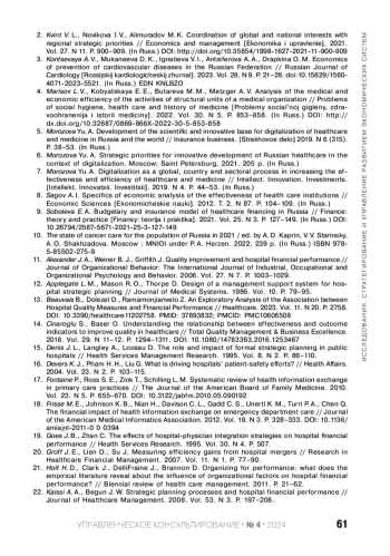 21. Holt H. D., Clark J., DelliFraine J., Brannon D. Organizing for performance: what does the empirical literature reveal about the influence of organizational factors on hospital financial performance? // Biennial review of health care management. 2011. P. 21-62.