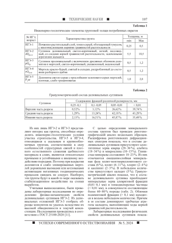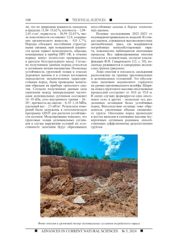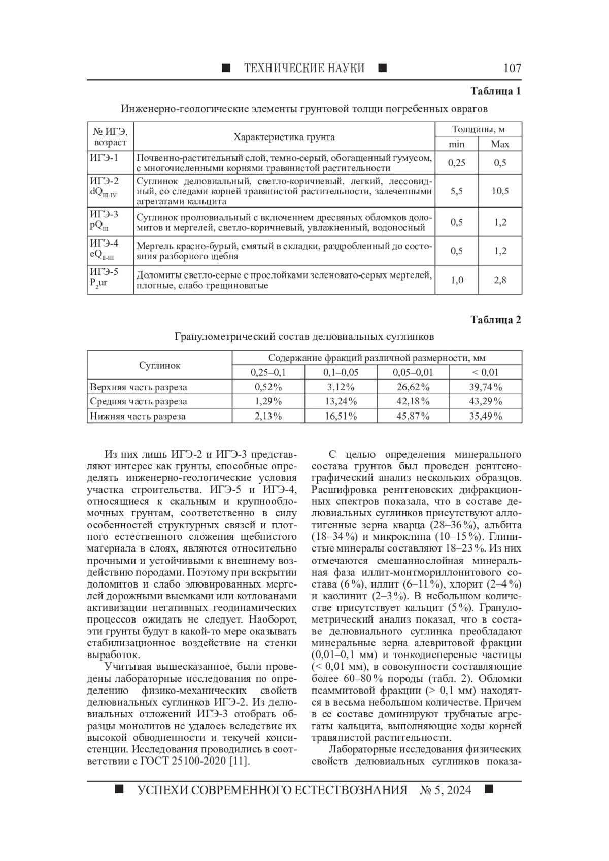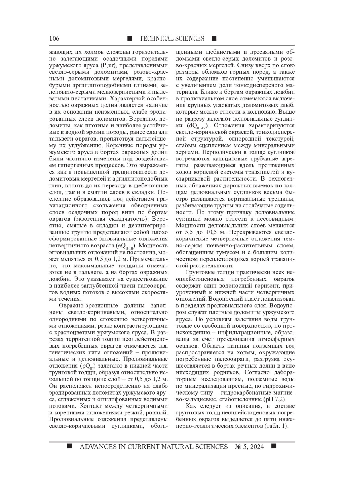 Грунтовые толщи погребенных оврагов неоплейстоценового возраста, осложняющие скальный массив уржумского яруса в восточной части Приволжской возвышенности, представляют собой потенциально опасные участки при вскрытии их дорожными выемками и котлованами. Это обусловлено особенностями их строения и наличием в основании эрозионных овражных долин водоносных пластов. Согласно полевым наблюдениям в составе грунтовых толщ погребенных оврагов выделяется снизу вверх по разрезу пять инженерно-геологических элементов: слабо измененные доломиты уржумского яруса в основании четвертичного комплекса отложений (ИГЭ-1), элювированные мергели, сильно дезинтегрированные и смятые в экзогенные складки (ИГЭ-2), овражный пролювий (ИГЭ-3), овражный делювий (ИГЭ-4) и почвенно-растительный слой (ИГЭ-5). В нижней части погребенных оврагов сформирован водоносный горизонт, ложем которого служат плотные доломиты уржумского яруса, водовмещающими являются делювиальные отложения, сложенные щебнисто-дресвяным материалом вперемешку с пылеватыми и глинистыми минеральными частичками. Из всех перечисленных грунтов на строительные свойства грунтовой толщи наибольшее влияние будут оказывать пролювиально-делювиальные отложения. Пролювиальные отложения в силу их высокой обводненности способствуют тиксотропному разжижению грунтов при вскрытии грунтовой толщи техногенными выработками. Делювиальные отложения, сложенные легкими лессовидными суглинками, вследствие высокой пористости, наличия нестойких к воздействию воды структурных связей, низкой прочности на сжатие и небольшой силы сцепления между минеральными частицами определяют низкую устойчивость грунтовой толщи в стенках техногенных обнажений. При нарушении естественных условий залегания грунтовой толщи дорожными выемками или котлованами в них активизируются оползневые процессы.