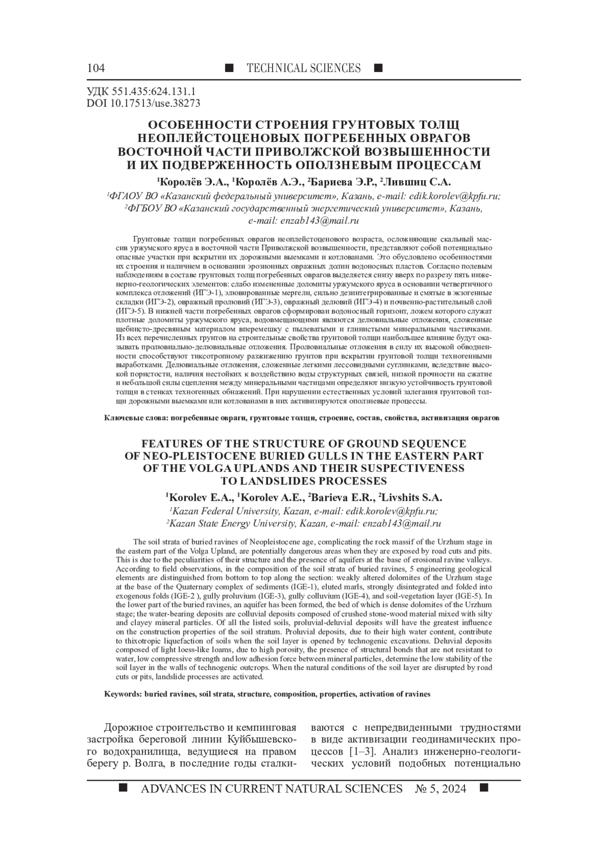 3. Латыпов А.И., Гараева А.Н., Яббарова Е.Н., Усманов Р.М., Королёв А.Э. Природно-техногенные геодинамические процессы, активизированные при устройстве выемок грунта трассы М-12 на территории Приволжской возвышенности // Сергеевские чтения. Фундаментальные и прикладные вопросы инженерной геодинамики: материалы годичной сессии Научного совета РАН по проблемам геоэкологии, инженерной геологии и гидрогеологии. 2023. С. 104-108. EDN: YFNQZY