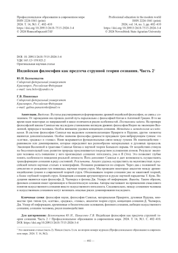 Введение. В статье рассматриваются формирование древней индийской философии, ее связь с сознанием. От зарождения она прошла долгий путь параллельно с философией Китая и Античной Греции. В то же время идеи некоторых ее направлений и школ отличаются рядом особенностей.