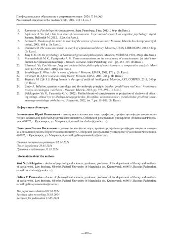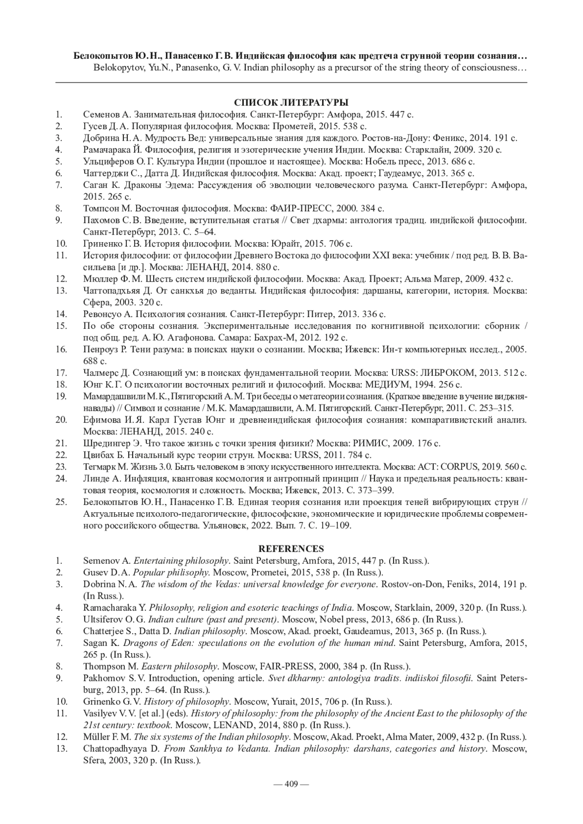 25. Белокопытов Ю. Н., Панасенко Г. В. Единая теория сознания или проекция теней вибрирующих струн // Актуальные психолого-педагогические, философские, экономические и юридические проблемы современного российского общества. Ульяновск, 2022. Вып. 7. С. 19-109.