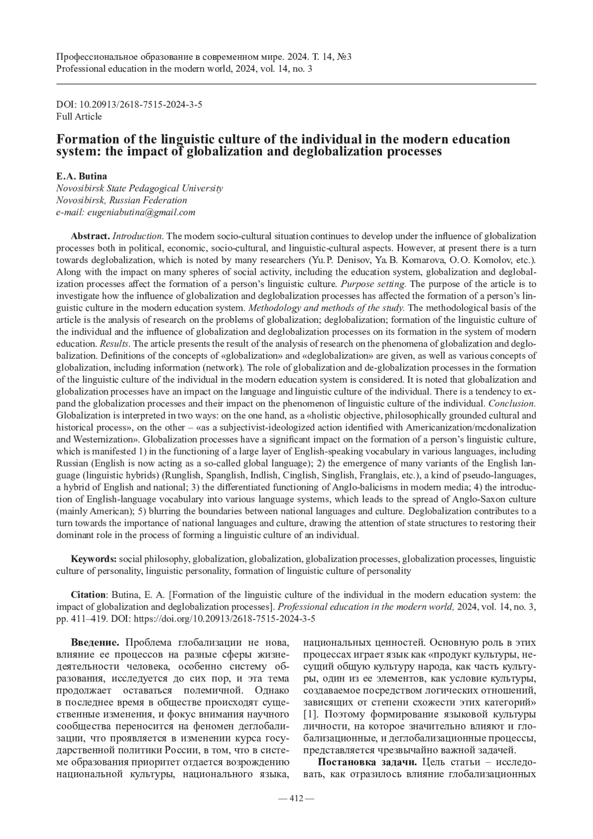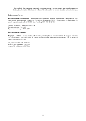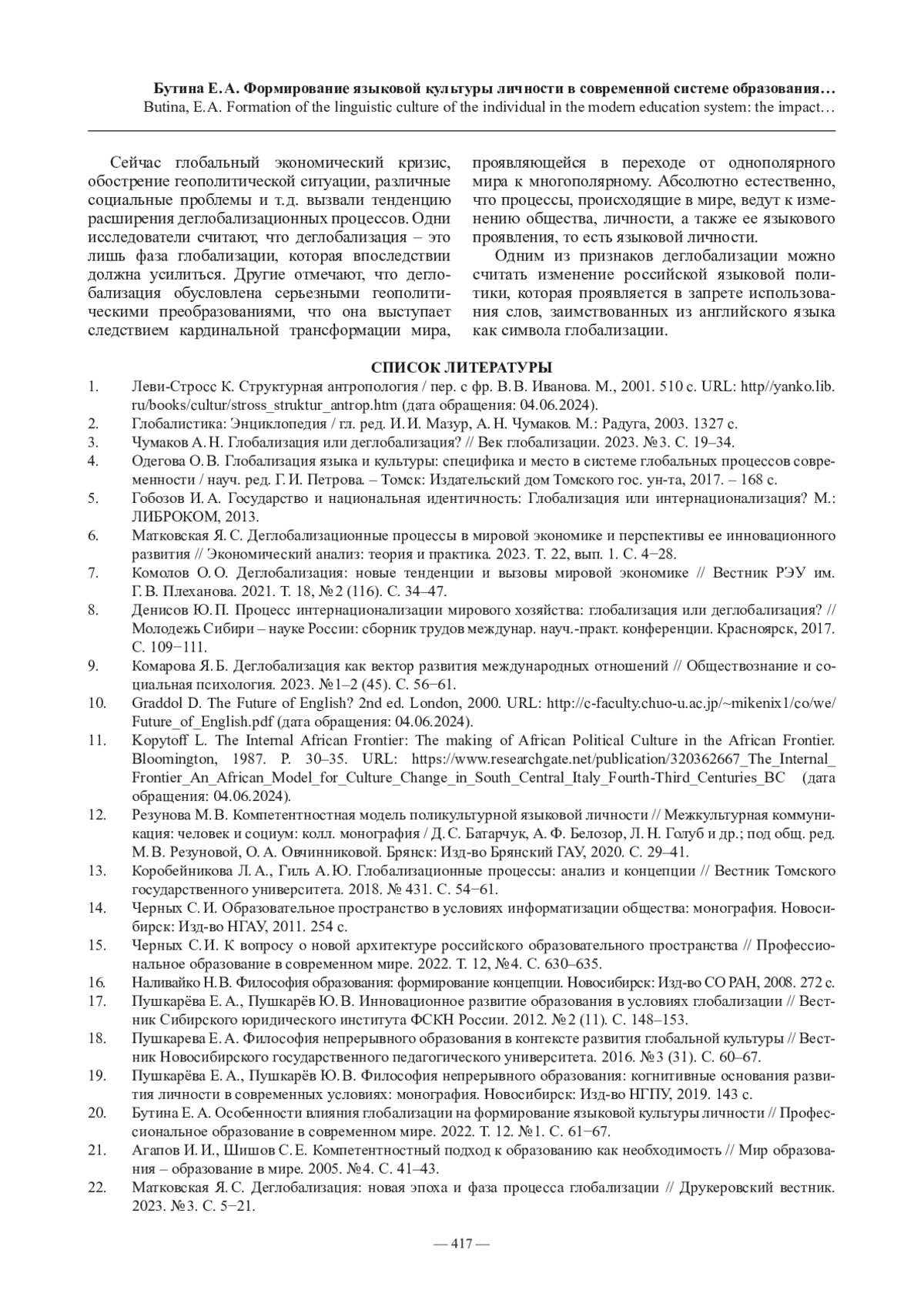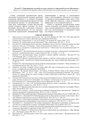 20. Бутина Е. А. Особенности влияния глобализации на формирование языковой культуры личности // Профессиональное образование в современном мире. 2022. Т. 12. № 1. С. 61−67.