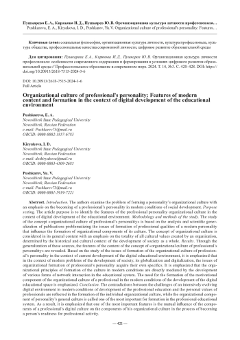 Выводы. На становлении организационной культуры отдельной личности отражаются противоречия между вызовами интенсивно развивающейся цифровой среды в современных условиях развития профессионального образования и личностными ценностными установками профессионалов, при этом организационный компонент общей культуры личности называется одним из наиболее важных для формирования в системе подготовки профессионала. В итоге подчеркивается, что одной из важнейших особенностей является влияние компонентов цифровой культуры профессионала на составляющие его организационной культуры в процессе становления готовности личности к профессиональной деятельности.