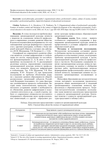 Методика и методология исследования. Исследование содержания понятия «организационная культура личности профессионала» основано на анализе и обобщении научных работ, проблематизирующих вопросы формирования профессиональных качеств современной личности, оказывающих влияние на становление организационных составляющих ее культуры. Понятие организационной культуры рассматривается в ее общем содержании с акцентом на совокупность всех культурных ценностей, создаваемых организацией, определяемых историко-культурным контекстом развития общества в целом.