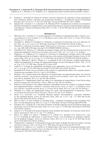 21. Хромова А. О., Бухтаярова Е. Ю., Климова А. А., Курносова М. А., Дружинина М. В. Исследование мотивационного, креативного, коммуникативного и организационного компонентов готовности будущих педагогов к использованию инновационных технологий // Science for Education Today. 2022. Т. 12, № 4. С. 7-25. https://doi.org/10.15293/2658-6762.2204.01.
