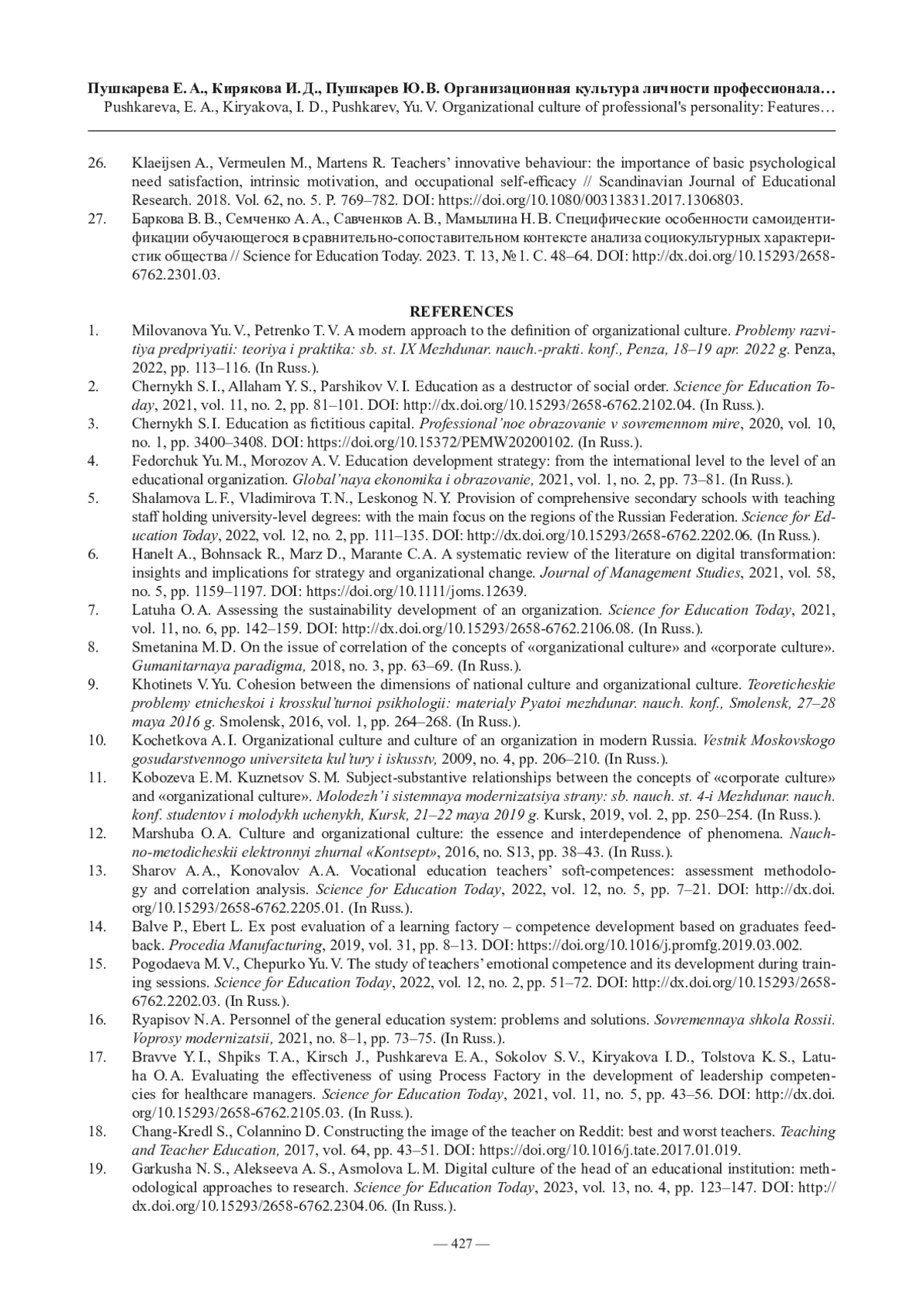 17. Бравве Ю. И., Шпикс Т. А., Кирш Я., Пушкарёва Е. А., Соколов С. В., Кирякова И. Д., Толстова К. С., Латуха О. А. Оценка эффективности Фабрики процессов в формировании профессионально значимых компетенций руководителей организации // Science for Education Today. 2021. Т. 11, № 5. С. 43-56. https://doi.org/http:// http://dx.doi.org/10.15293/2658-6762.2105.03.