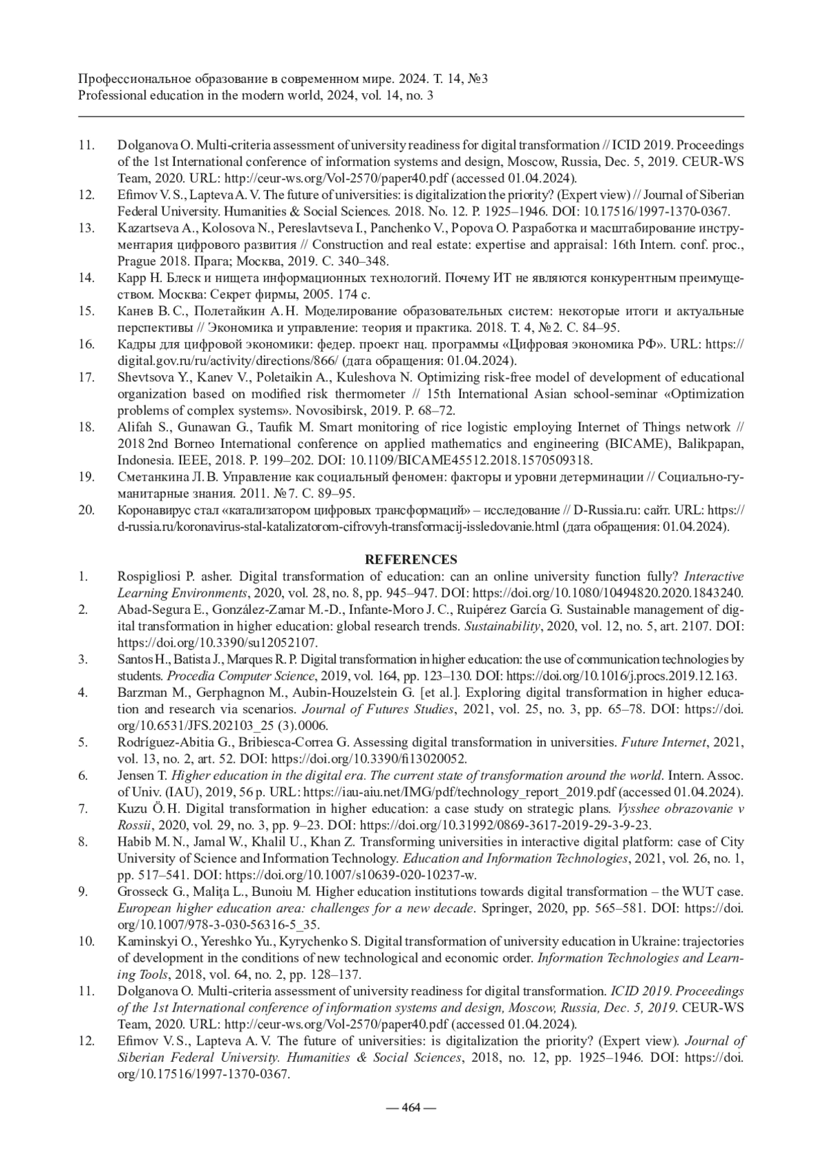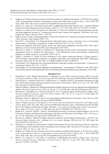 11. Dolganova O. Multi-criteria assessment of university readiness for digital transformation // ICID 2019. Proceedings of the 1st International conference of information systems and design, Moscow, Russia, Dec. 5, 2019. CEUR-WS Team, 2020. URL: http://ceur-ws.org/Vol-2570/paper40.pdf (accessed 01.04.2024).