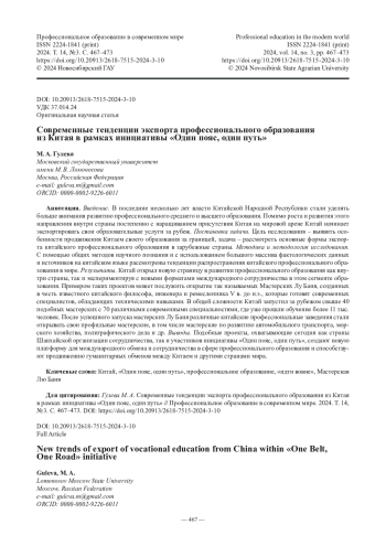 Введение. В последние несколько лет власти Китайской Народной Республики стали уделять больше внимания развитию профессионального среднего и высшего образования. Помимо роста и развития этого направления внутри страны постепенно с наращиванием присутствия Китая на мировой арене Китай начинает экспортировать свои образовательные услуги за рубеж.
