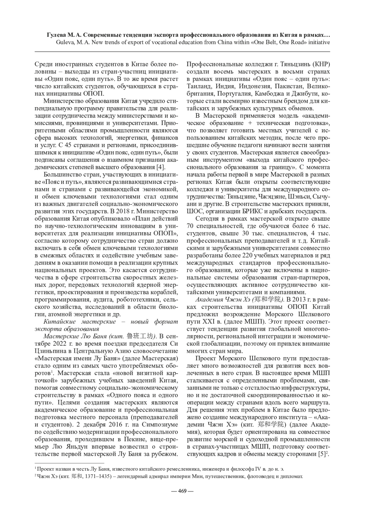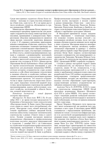 Результаты. Китай открыл новую страницу в развитии профессионального образования как внутри страны, так и экспериментируя с новыми форматами международного сотрудничества в этом сегменте образования. Примером таких проектов может послужить открытие так называемых Мастерских Лу Баня, созданных в честь известного китайского философа, инженера и ремесленника V в. до н. э., которые готовят современных специалистов, обладающих техническими навыками. В общей сложности Китай запустил за рубежом свыше 40 подобных мастерских с 70 различными современными специальностями, где уже прошли обучение более 11 тыс. человек. После успешного запуска мастерских Лу Баня различные китайские профессиональные заведения стали открывать свои профильные мастерские, в том числе мастерские по развитию автомобильного транспорта, морского хозяйства, полиграфического дела и др.