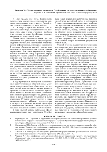 Выводы. Результаты наблюдения показали, что у участников социально-педагогической практики проявляется положительная мажорная заряженность, они демонстрируют повышенный интерес к самопознанию. Эффектом от социально-педагогической практики является выраженный интерес к картам СоулКоллажа, участникам социально-педагогической практики, изучению восточной философии и юнгинианских архетипов.