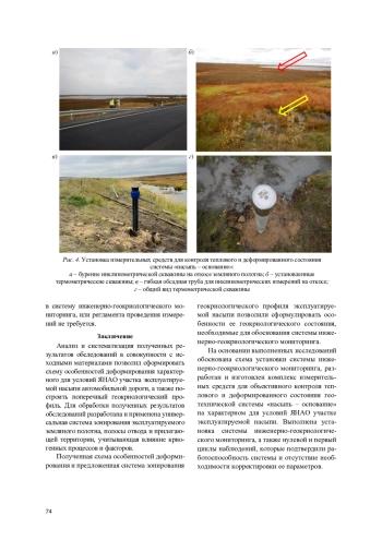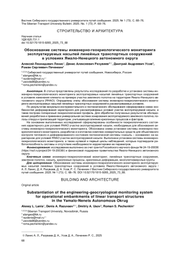 На основании выполненных исследований сформулированы особенности геокриологического состояния характерного для условий ЯНАО участка эксплуатируемой насыпи, необходимые для обоснования системы инженерно-геокриологического мониторинга. Обоснована схема установки системы инженерно-геокриологического мониторинга, разработан и изготовлен комплекс измерительных средств для объективного контроля теплового и деформированного состояния геотехнической системы «насыпь - основание» на характерном для условий ЯНАо участке эксплуатируемой насыпи. Выполнена установка системы инженерногеокриологического мониторинга, а также нулевой и первый циклы наблюдений, которые подтвердили работоспособность системы и отсутствие необходимости корректировки ее параметров.