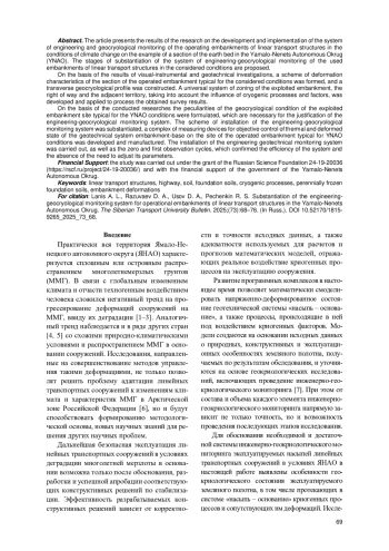 Практически вся территория Ямало-Ненецкого автономного округа (ЯНАО) характеризуется сплошным или островным распространением многолетнемерзлых грунтов (ММГ). В связи с глобальным изменением климата и отчасти техногенным воздействием человека сложился негативный тренд на прогрессирование деформаций сооружений на ММГ, ввиду их деградации [1–3]. Аналогичный тренд наблюдается и в ряде других стран [4, 5] со схожими природно-климатическими условиями и распространением ММГ в основании сооружений. Исследования, направленные на совершенствование методов управления такими деформациями, не только позволят решить проблему адаптации линейных транспортных сооружений к изменениям климата и характеристик ММГ в Арктической зоне Российской Федерации [6], но и будут способствовать формированию методологической основы, новых научных знаний для решения других научных проблем.