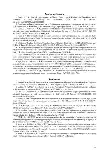 3. Lanis A. L., Razuvaev D. A. Systematization of features and requirements for geological survey of railroad subgrades functioning in cold regions // Sciences in Cold and Arid Regions. 2017. Vol. 9, Iss. 3. Р. 205-212. DOI: 10.3724/SP.J.1226.2017.00205 EDN: XOEQKD