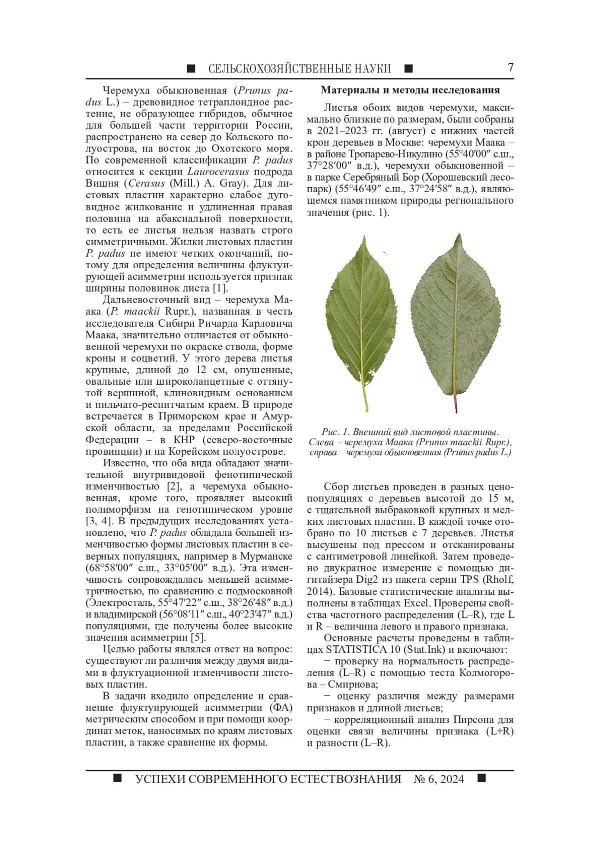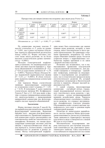 Проанализированы форма и асимметрия листовых пластин двух видов рода Prunus L.: черемухи обыкновенной (P. padus L.) и черемухи Маака (P. maackii Rupr.) в г. Москве. Особенности формы тестировались методом геометрической морфометрии. Флуктуирующая и направленная асимметрия определялись аналогом двухфакторного дисперсионного анализа в прокрустовом пространстве. Для сравнения использовалась формула нормирующей разности (ФА 2). Расчеты выполнялись в среде STATISTICA 10 (Stat. Ink) и включали: проверку на нормальность распределения (L-R) с помощью теста Колмогорова - Смирнова; оценку различия между размерами признаков и длиной листьев; корреляционный анализ Пирсона для оценки связи величины признака (L+R) и разности (L-R). По метрическому признаку ширине половины листа флуктуирующая асимметрия названных видов не отличалась. В морфо-геометрическом анализе общая асимметрия преимущественно содержала направленную асимметрию, превышавшую флуктуирующую асимметрию в 2,5-10,0 раза. Оба вида обладали высокой вариативностью формы листовых пластин (р < 0,0001). Морфо-геометрический метод выявил слабое проявление флуктуирующей асимметрии или ее отсутствие на фоне явственного различия в форме (p < 0,001), особенно листьев черемухи Маака. Метод геометрической морфометрии оказался эффективнее метода на основе метрических признаков и позволил установить, что в разные годы форма листовых пластин в большей степени зависела от условий среды, чем от генотипических особенностей исследованных видов.
