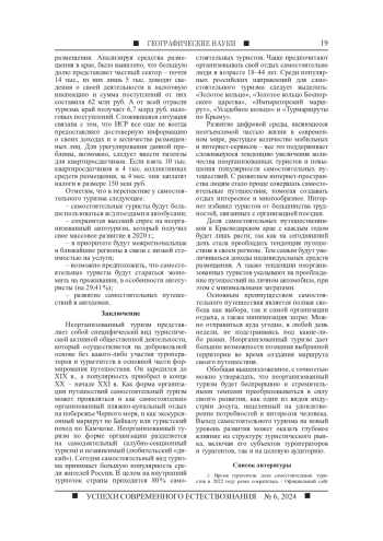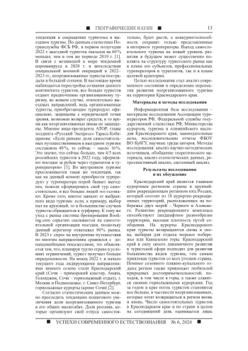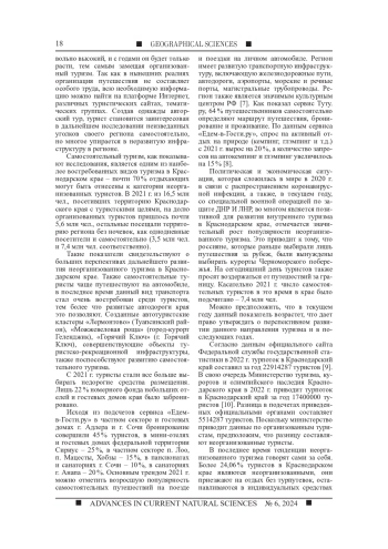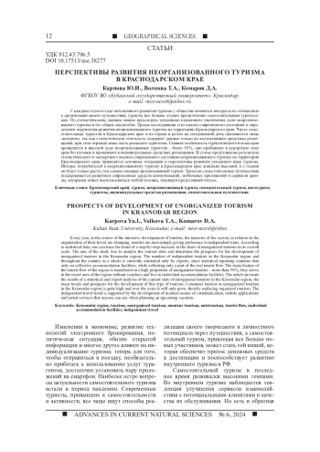 С каждым годом в ходе интенсивного развития туризма у общества меняются интересы по отношению к организации своего путешествия, туристы все больше отдают предпочтение самостоятельным турпоездкам. По статистическим данным можно проследить тенденцию пошагового увеличения доли неорганизованного туризма в его общих масштабах. Целью исследования стал анализ современного состояния и определение перспектив развития неорганизованного туризма на территории Краснодарского края. Число самостоятельных туристов в Краснодарском крае и по стране в целом на сегодняшний день оценивается лишь экспертно, так как статистическая отчетность содержит данные только по коллективным средствам размещения, при этом отражая лишь часть реального турпотока. Главная особенность туристического потока края проявляется в высокой доле неорганизованных туристов - более 50 %, они прибывают в курортную зону края без путевок и проживают в индивидуальных средствах размещения. В статье представлены результаты статистического и экспертного анализа современного состояния неорганизованного туризма на территории Краснодарского края, приводятся основные тенденции и перспективы развития указанного вида туризма. Интерес потребителей к неорганизованному туризму в Краснодарском крае довольно высокий, и с годами он будет только расти, тем самым замещая организованный туризм. Тренд на самостоятельные путешествия поддерживается развитием современных средств коммуникаций, мобильных приложений и сервисов аренды, которыми может воспользоваться любой человек, планируя предстоящий отпуск.